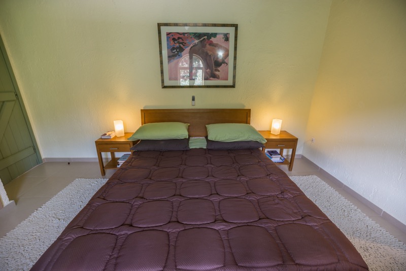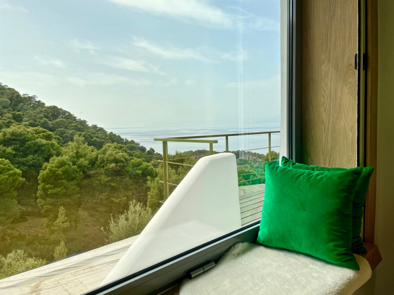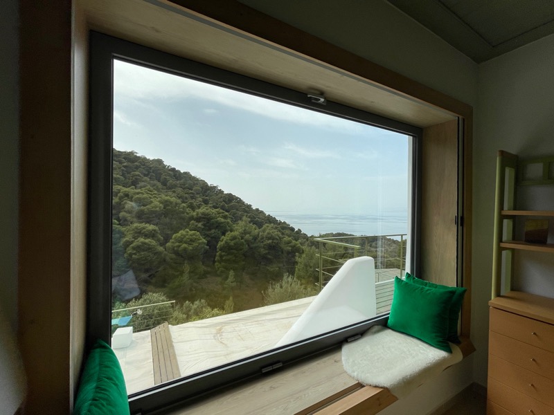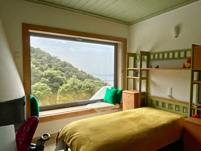 All bedrooms have large balcony doors with a view to the forest, pool, and garden.